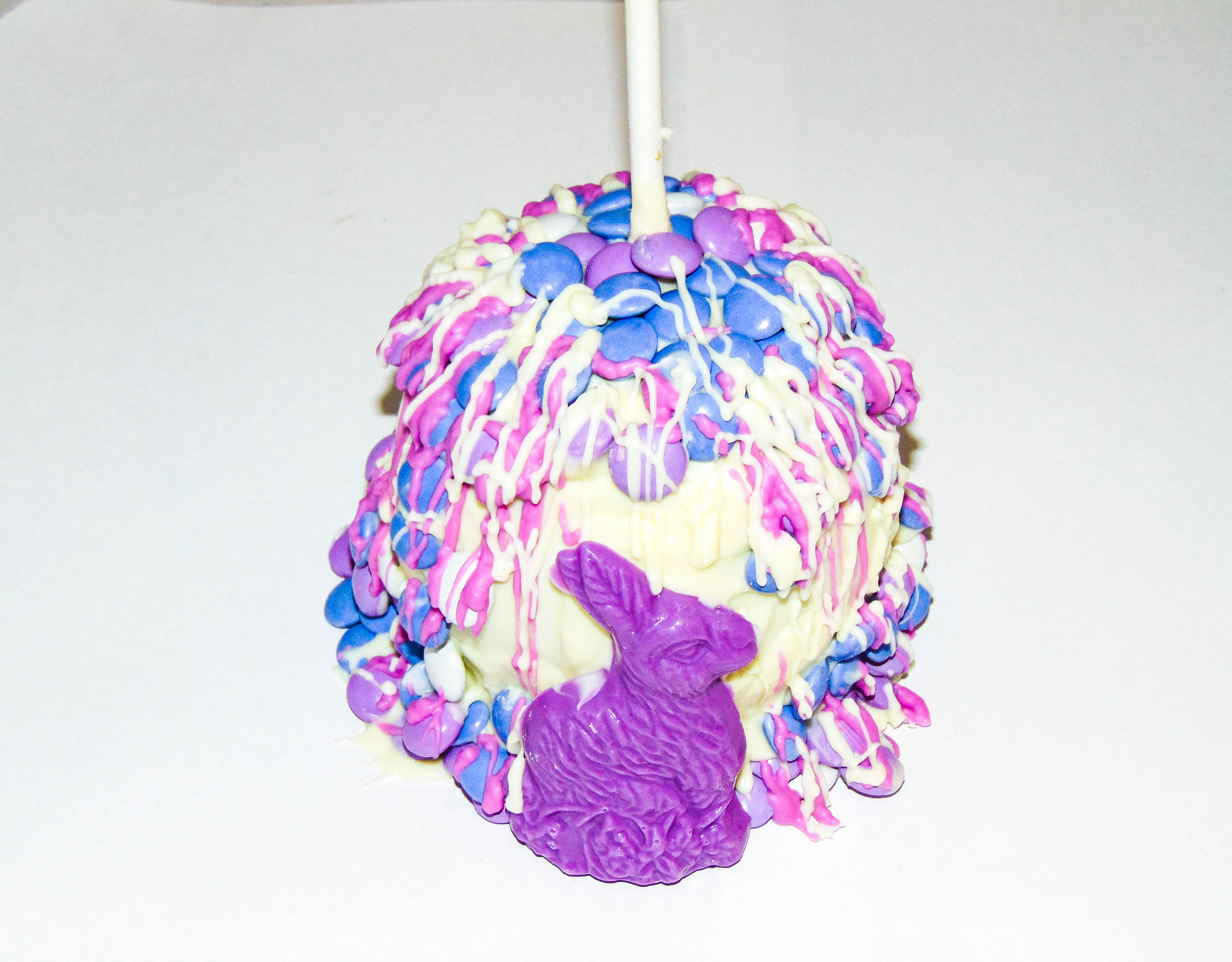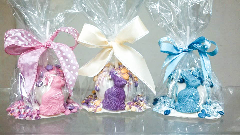 Enjoy this Gourmet White Chocolate Apple adorned with colorful Easter bunny chocolate – Buy online today.