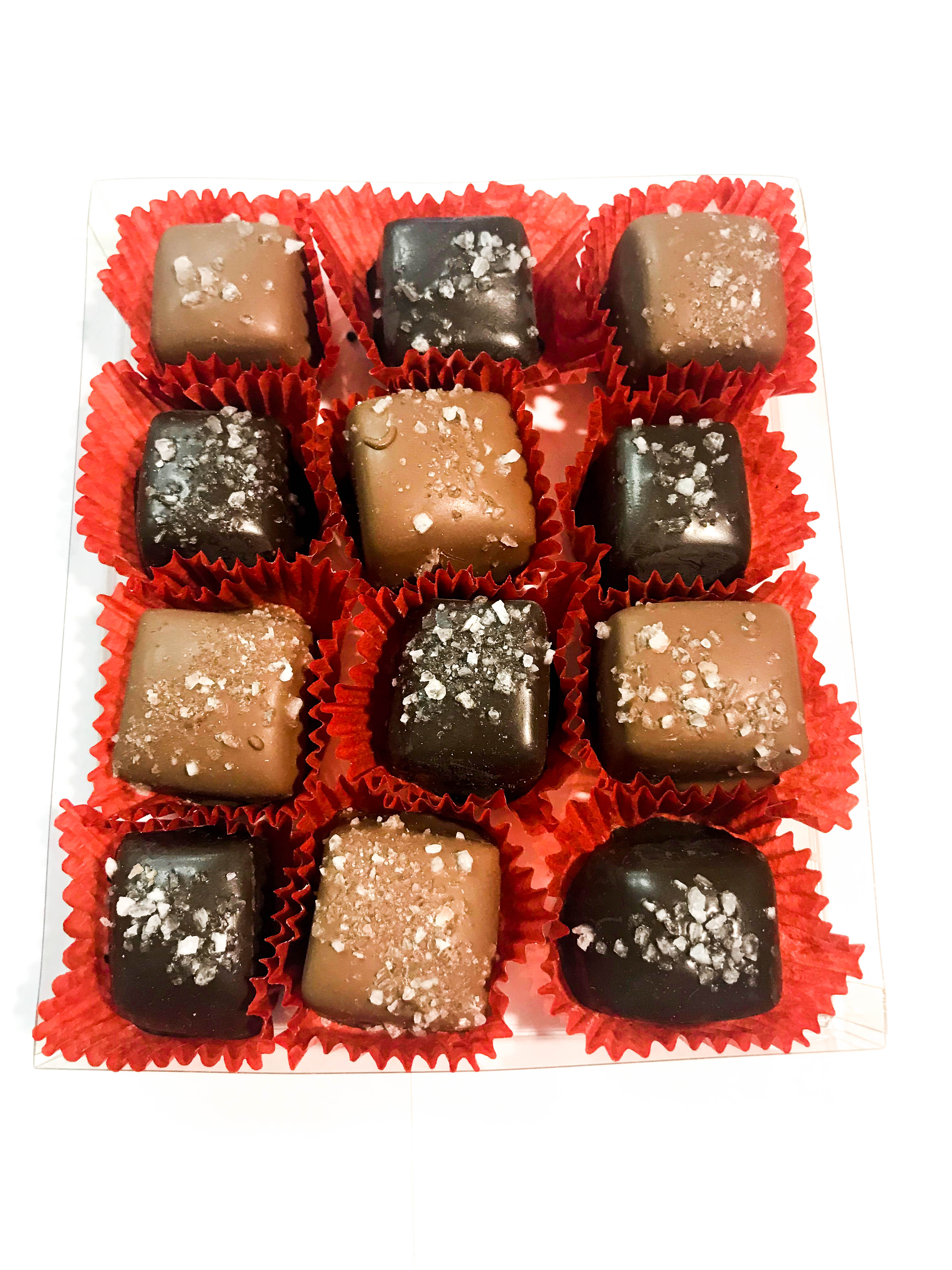 A half pound of dark chocolate, milk chocolate, and white chocolate sea salted caramels.