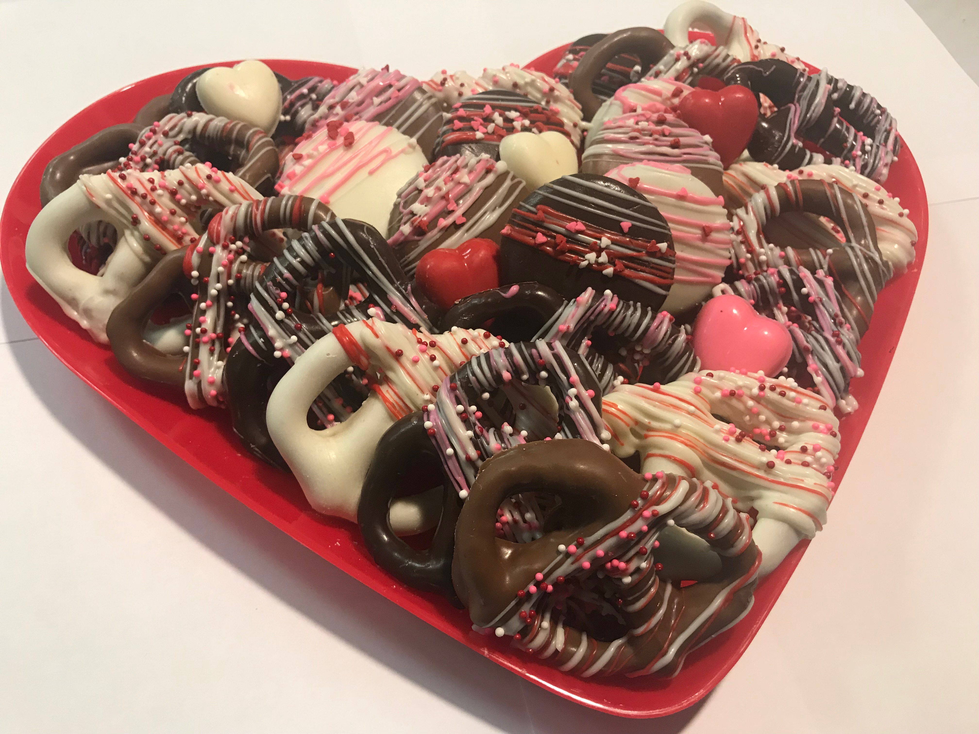 1.50 lbs. tray of chocolate dipped pretzels and Oreos beautifully decorated for Valentine’s Day